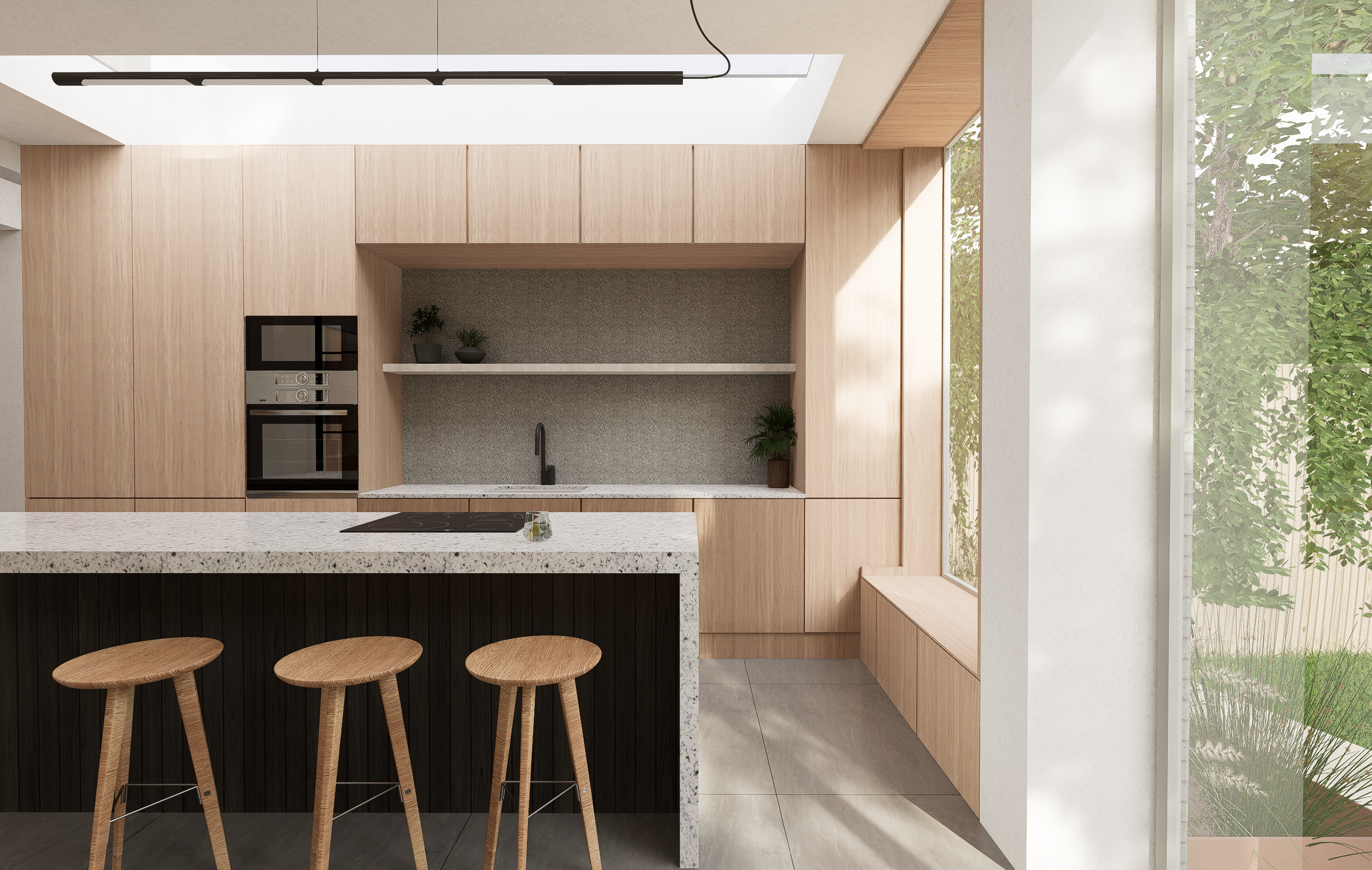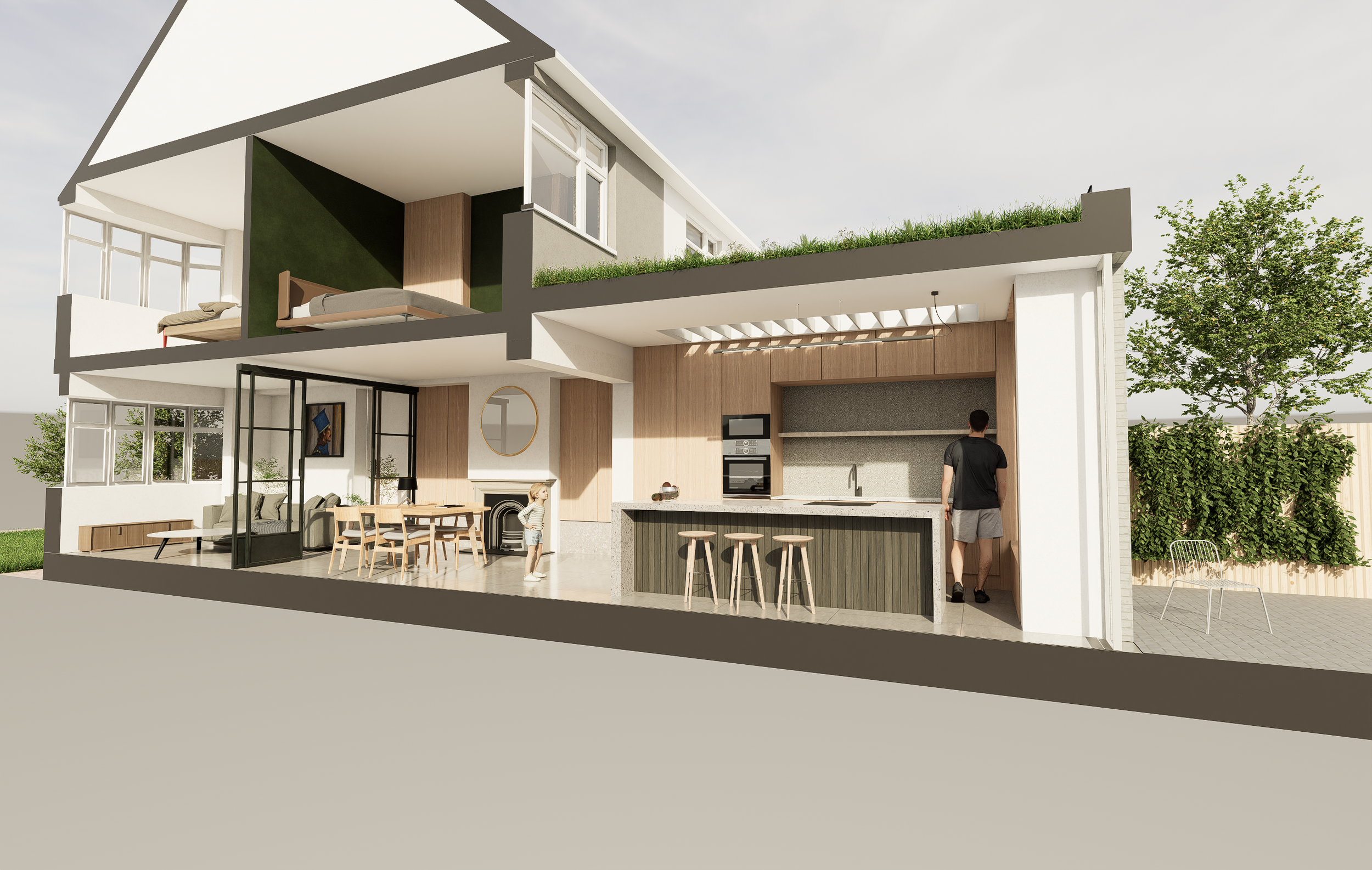 A key design driver was to strengthen the relationship between the new living spaces and the rear garden. This is achieved through the introduction of oversized glazing and a large sliding door, maximising views, daylight penetration, and access to the outdoor space. The result is a light-filled, flexible family environment that enhances both the usability of the home and its connection to the garden.